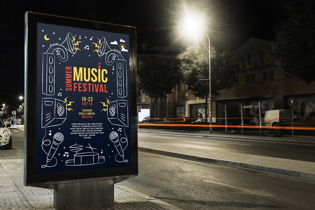 Mockup de cartel publicitario en un . Relación de aspecto del diseño: Descarga mockups psd de calle | uso comercial | edita también en el online mockup generator | maquetas editables de camisetas, branding, productos y ropa. Mockups de poster, tazas, vectores gratis y muchos .